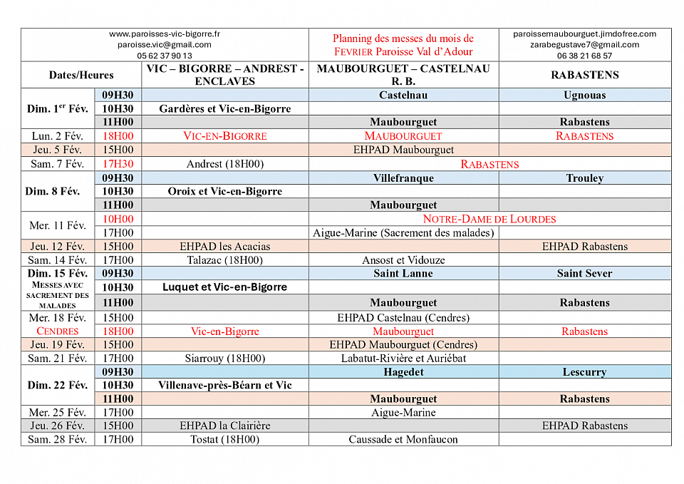 Planning des messes de la Paroisse du Pays de Vic-Maubourguet
